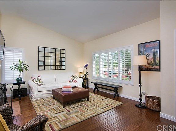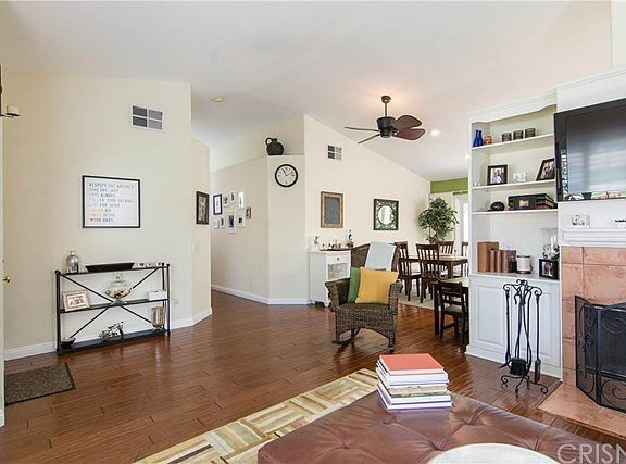 Single Story home on corner lot in Sunset Hills tract! This 3 bed, 2 bath home features a living room with fireplace and built-ins, kitchen with stainless appliances, and dining area the connects the space. Warm, rich wood flooring through the living room and hallway, tile in the kitchen and carpet in the bedrooms. Plantation shutters and newer windows throughout. Previous owner created a small laundry room so no more lugging laundry into the garage! Large backyard with custom water feature. Move in ready and so light and bright. This home has a rare combination for Canyon Country: NEWER (1997), NO HOA, NO MELLO ROOS, AND GREAT ACCESS TO FREEWAYS AND SHOPPING!