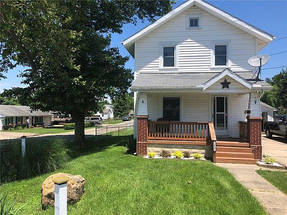 Beautifully remodeled home. Lots of curb appeal! Open living room and dining room with new flooring, paint, & ceilings! Updated kitchen with new refrigerator and stove. Updated half bath off kitchen. Double doors off kitchen lead to large 2 tier deck and fenced in backyard. Upstairs features a completely remodeled full bath that you'll love! 2 bedrooms with hardwood floors. Full unfinished basement with laundry hookups, glass block windows, and 200 amp electric. Updated replacement windows throughout. 1 1/2 car detached garage and shed with electric. Covered front porch for relaxing.