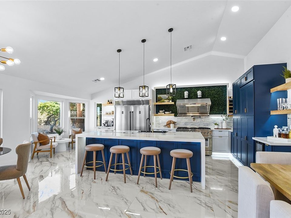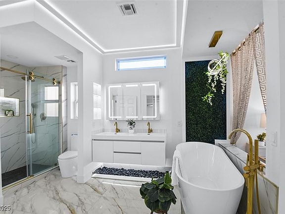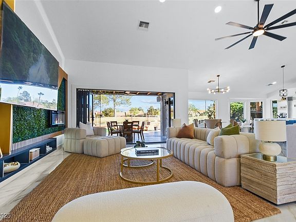 Boxwood on Golfside Dr by Michael Mair Luxury is a one-of-a-kind, fully custom 2 bed, 2 bath modern remodel on the Palm Valley Golf Course in Sun City Summerlin. Designed over 9 months with high-end finishes, this 1,653 sq ft home features porcelain tile flooring, designer lighting, new windows, and an open layout made for entertaining. The custom entertainment wall includes acoustic wood paneling, 85” TV, electric fireplace, floating shelves, and LED lighting. The chef’s kitchen boasts luxury appliances, walk-thru pantry, multifunction sink, reverse osmosis, and in-cabinet lighting. Spa-like primary bath with floating double vanity, deep soaking tub, black river rock, and LED accents. Golf course patio includes a fire/waterfall feature, artificial turf, boxwood privacy wall, and shaded west-facing exposure. 2-car garage with golf cart space and silent opener. Truly a standout in design and function. You won't find another home like it!