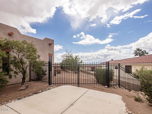 Must see custom Sante Fe home with million dollar views of the Colorado River, Laughlin casinos and surrounding mountains. Open floor concept with entertaining kitchen island. Custom Latilla & Viga ceilings and 2 Kiva style fireplaces create a Santa Fe ambiance. Luxurious master suite with extended seating and office area. Guest suite appointed like a mini master suite. French dooors open out onto an expansive patio deck where you can view dramatic breathtaking sunsets. Beautiful mountain views, casino lights in the evening from the patio overlooking a tranquil, stacked stone water feature. This home boasts custom quality all over! Please call for your personal tour.
