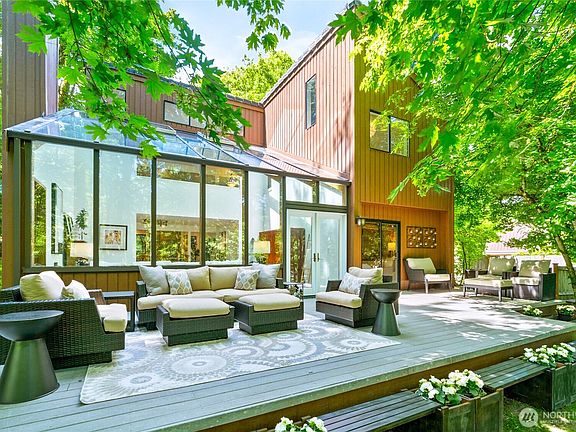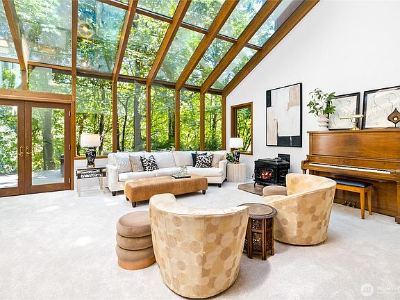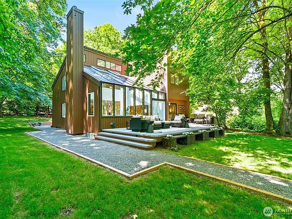 Tucked beneath a canopy of lush green trees, this storybook lakeside home offers 40 feet of Lake Fenwick shoreline and a setting that feels like a hidden retreat. A winding backyard path leads to the water’s edge, with a mid-trail deck that floats among the trees. Inside, the heart of the home is a spectacular solarium-style great room with two-story soaring windows that blur the line between indoors and out. The remodeled kitchen features rich wood cabinetry, slab granite, and a bold full-height backsplash. A main floor primary suite takes in tranquil lake views, while the vaulted upstairs loft offers endless flex space for work, play, or retreat. New carpet, refinished hardwoods, slate roof, new septic, and just 1 mile to light rail!