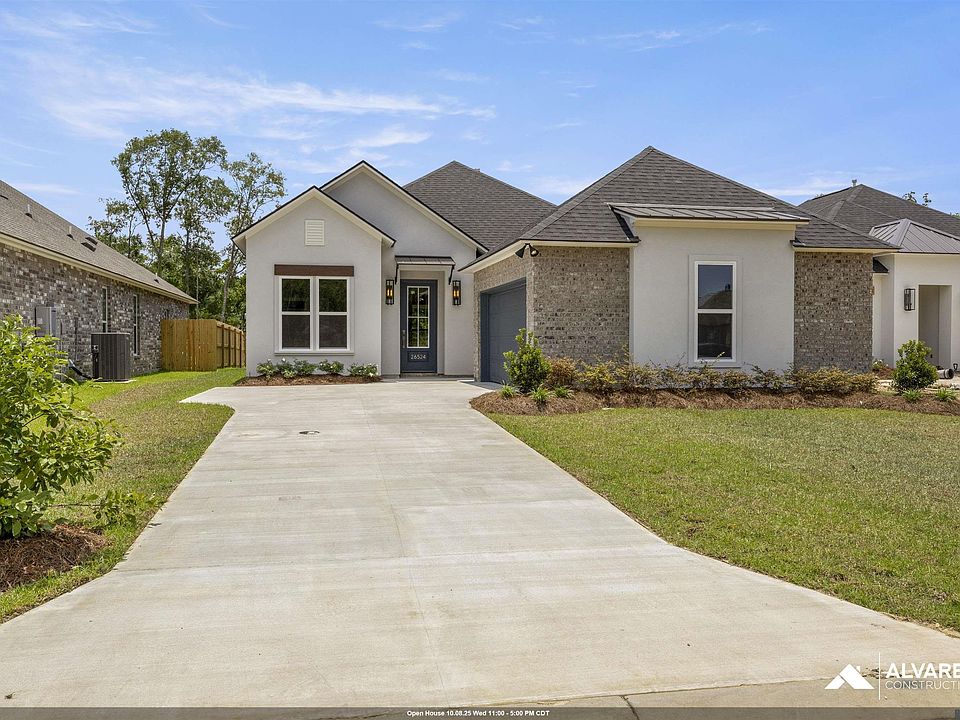 Estimated completion: complete and ready for move-in. Alvarez Construction is bringing luxury living to Livingston Parish with 71 homesites offering 29 style options. All homes will range from 3-5 bedrooms, 2-3 bathrooms and will start at 1,555 sq ft. Juban Gardens also boasts two ponds and a green space, adding to the unique character of the community. Located off I-12 and near Juban Crossing Shopping Center, you are never far from all the shopping, dining, and entertainment you could ever need. As you enter your new home, its luxury finishes await. Through the main living areas you'll find vinyl-plank floors, while the bathrooms and utility room feature tile flooring. The living areas and Owner's suite feature crown molding, and the kitchen boasts custom cabinetry, an oversized island, a gas cooktop, and 3cm granite countertops. Smart devices such as a Wi-Fi-enabled SmartHome hub, wireless security system, exterior security camera, Wi-Fi-enabled garage door, wireless smoke/heat combination detector, and a WiFi-enabled thermostat come included with your home - and for added peace of mind The Larch plan is a 4bed/3bath single story home offering open and spacious living areas with 12' high ceilings. Adjacent living and dining areas are perfect for entertaining. LVT floors and oversized ceramic throughout with carpet in the bedrooms. Gourmet kitchen with keeping area features chef's island, GE stainless steel smart appliances, gas cooktop, separate wall oven and walk-in pantry. Private Master bedroom has en-suite bathroom with dual vanities, walk-in shower, garden tub, WC, and walk-in closet. 3cm granite counters in kitchen and all baths.