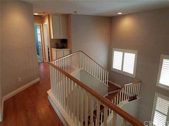 5 bedrooms, 1 bedroom downstairs. Living Room + Family Room with Fire Place. LR or FR could be used as a Formal Dining Room. Wood Floors through most of the home, Shutters throughout. Lots of Windows and a Soaring Ceiling make this a very Light and Bright Home. Master En Suite with His and Hers Walk in Closets, Bathroom with Dual Sinks, Separate Shower and tub. Nice size Laundry Room with Shelving. Garage set up with a nice Work Bench. Nicely landscaped backyard with a covered patio. Close to the Community Pool and Park. No Mello Roos.