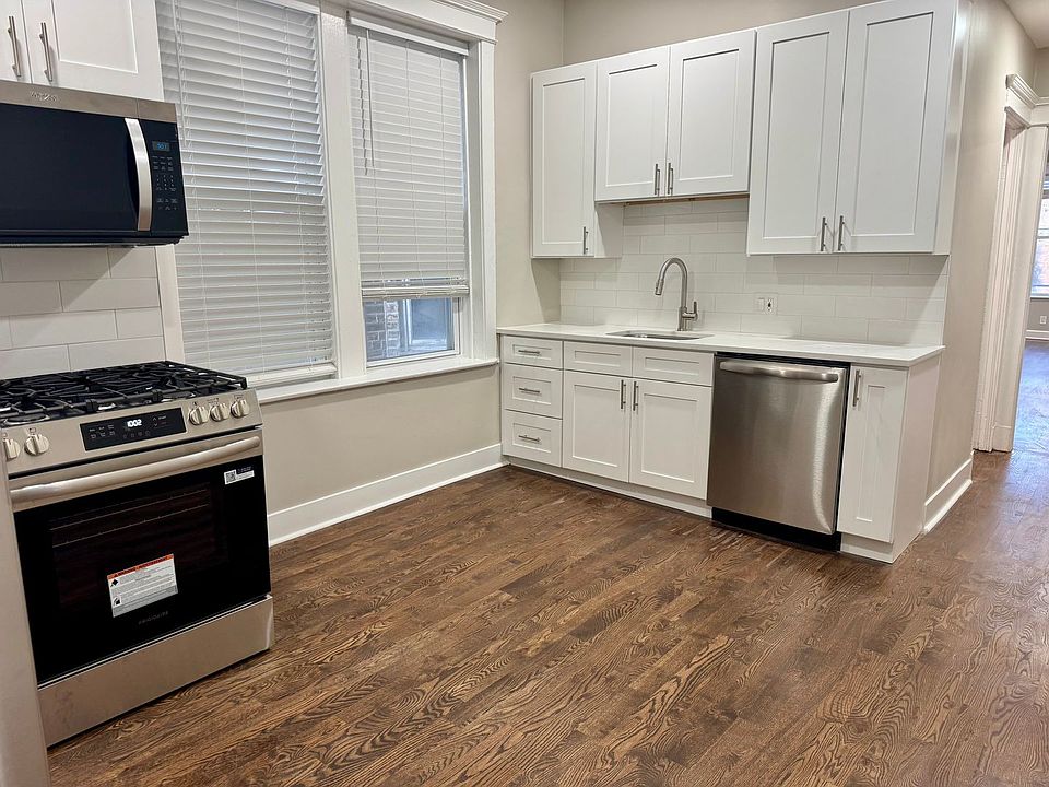 Recently renovated studio apartment in the heart of Humboldt Park! This bright garden unit features modern finishes throughout, wide-plank flooring, recessed lighting, and a sleek white kitchen with quartz countertops, subway tile backsplash, stainless steel appliances, and open shelving. Enjoy the convenience of in-unit laundry, central heat and A/C, and a functional open layout that makes great use of the space. The bathroom includes a full tub/shower combo and updated fixtures. Located just steps from Humboldt Park, this unit offers easy access to local cafes, restaurants, shops, and public transportation.