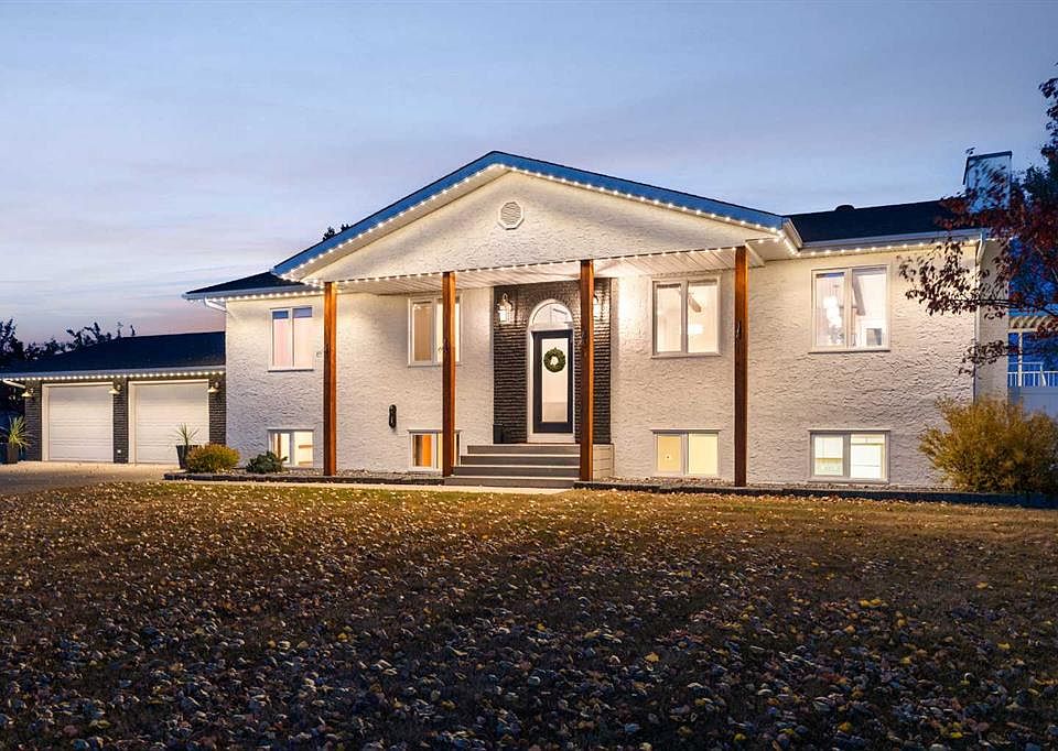 Experience the best of country living without sacrificing convenience in this impeccably upgraded estate, perched above the picturesque Canyon Ski Hill. Offering stunning year-round views and over 1,300 sq ft of beautifully finished space, this 5-bedroom, 3-bathroom home combines timeless design with modern comfort—perfect for families, entertainers, or those seeking a serene retreat. The heart of the home is a brand-new chef’s kitchen, designed to impress with a statement island, pot filler, custom spice storage, built-in cutting board, and premium appliances. An open-concept dining area features a custom bench with hidden storage, while the cozy living room is anchored by a sleek electric fireplace and built-in mantel. Throughout the main level, luxury vinyl plank flooring, designer paint, updated trim, doors, and curated lighting selections create a cohesive and inviting feel. The primary suite is a true haven, featuring a spa-style ensuite with double vanities, heated floors, and an oversized walk-in shower. Two additional bedrooms and a beautifully renovated guest bath complete the main floor. The fully developed lower level offers flexibility and space, complete with a second kitchen, large family room with gas fireplace, two additional bedrooms, and a full bath—perfect for extended family, guests, or a private retreat. This home is loaded with extras: central air, central vac, updated smoke detectors, a spacious laundry room, and peace-of-mind mechanical upgrades, including new furnaces, hot water heater, pressure tank, and a full plumbing overhaul. Step outside to enjoy the expansive covered deck with new railings, a 2023 hot tub, and a massive, fully fenced yard. For the hobbyist or professional, the 30x40 heated shop is fully outfitted with radiant heat, floor drains, tin walls, mezzanine, oversized door, and commercial air compressor. An oversized heated double garage (23x28) and large paved parking area provide ample space for RVs, trailers, and equipment. With a new septic system (2021) and every major system updated, this exceptional property is truly turn-key. Unmatched views, privacy, and refined living await!