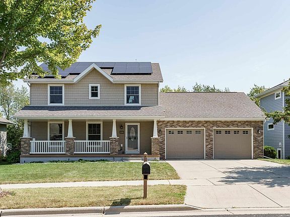 Fitchburg?s Oak Meadow home w/solar panels! Low monthly bills! Near dog parks, biking trails, & local conveniences. This home features a nicely furnished kitchen opening to the dining & family room with stone gas fireplace, plus beautiful 4-season room overlooking mature trees. Enjoy mornings on the large front porch. Large laundry room with storage completes the first floor. The primary suite offers a walk-in closet & en-suite, while two bedrooms share a spacious bath upstairs. The finished lower level features a full bath, bar, & theater room w/smart lights. Updates include solar panels, new AC & furnace (2024), fridge & water heater (2021), front door & landscaping & smart landscape lighting (2024), fresh paint (2025), new outdoor steps, freshly stained decking (2025). Make an offer!