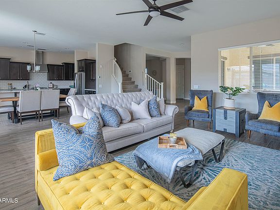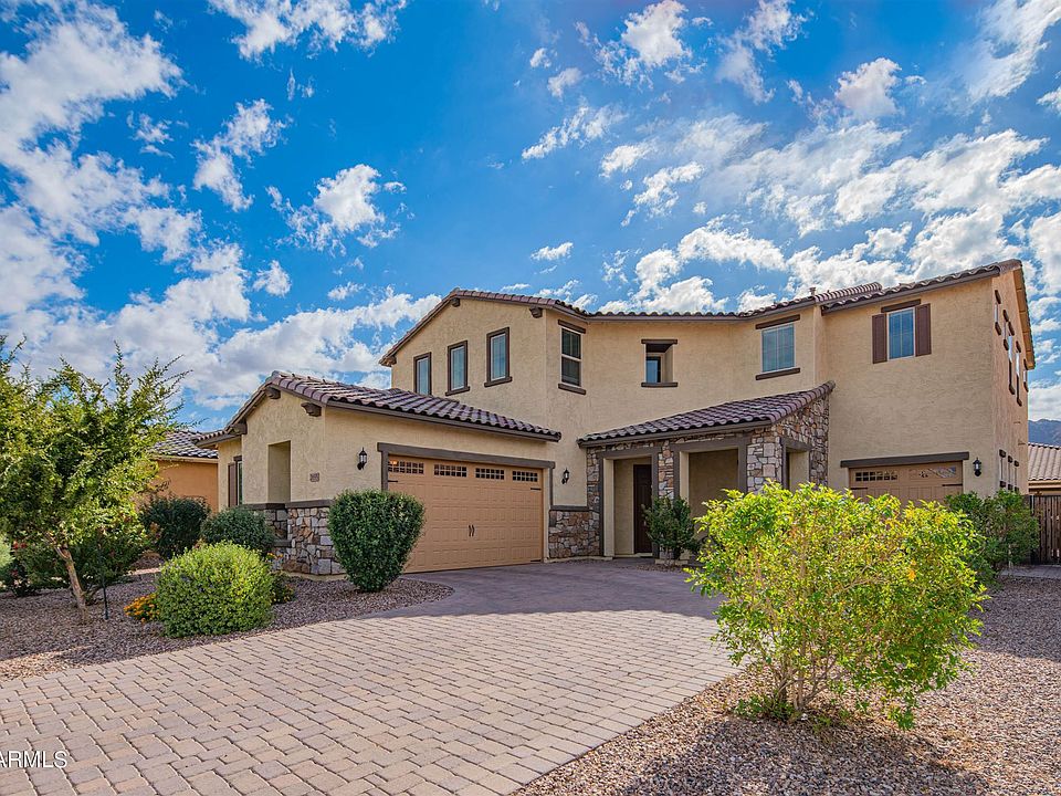 Stunning & highly upgraded family home in Adora Trails with views of the San Tan Mountains! Massive interior with nearly 3,700 SqFt, 5 beds, 4 baths + downstairs office & upstairs loft! Ideal open concept floor plan with wood-look tile, light grey paint, 8ft interior doors & tons of natural light. Entertain in the gourmet kitchen featuring staggered cabinetry, upgraded granite, white subway tile backsplash, kitchen island & breakfast bar, stainless steel appliances, gas cooktop, huge pantry & coffee bar. A grand staircase leads to the 2nd level with the bedrooms, loft & laundry room. Enormous master retreat features a soaking tub, shower w/rain shower head, dual sinks + make-up vanity, & walk-in closet. Gorgeous low maintenance backyard with travertine, gas BBQ, fire pit & synthetic grass.