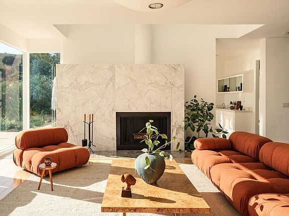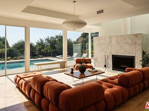 Set in the hills just below the Griffith Observatory, 2655 Nottingham Avenue offers a rare blend of privacy, architectural design, and sweeping views from downtown Los Angeles to the ocean. This home opens to a large living room, framed by floor-to-ceiling windows that fill the space with natural light and offer incredible views from every direction. Each room is thoughtfully composed, and sculpted archways connect from one space to the next. The dining room's curved corner window is a statement, framing lush greenery that creates an incredible visual. The kitchen, bright and minimalist in design, is adjacent to a full laundry room with outdoor access to the spacious lot of over 25,000 square feet. Also on the main level, a guest suite with full-length windows, a private terrace, and an ensuite bathroom provides a serene retreat for guests. The sculptural staircase, wrapped in green foliage and illuminated by a skylight, curves gracefully to the upper level. The primary suite is impressive, with panoramic views that stretch from the heart of the city to the Pacific. A private wraparound balcony offers a quiet vantage point, perfect for morning coffee or evening sunsets. The ensuite primary bathroom features rich green tile, dual vanities, and the spacious primary closet includes an additional vanity area. Two guest rooms open to the large upper-level balcony through arched glass doors, while a third guest room has its own private balcony, perfectly framed by arched windows. Outside, the design is reminiscent of Palm Springs, with a large, newly refinished pool, sun-drenched lounge area, and dining area surrounded by native landscaping. Created to embrace California's indoor-outdoor lifestyle, every detail of this home showcases light, seamless architectural design, and the spectacular natural backdrop of Los Feliz that surrounds it - all just minutes from the trails of Griffith Park and the iconic Greek Theatre.