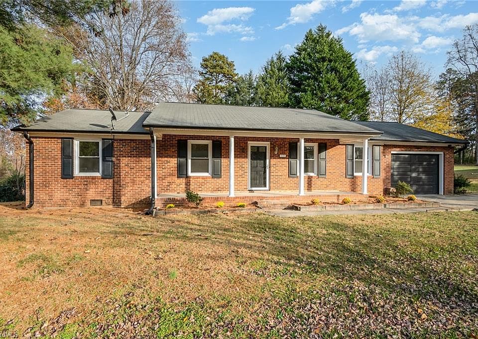 Charming and beautifully refreshed brick ranch in a peaceful country setting of Winston-Salem! This inviting 3-bedroom, 2-bath home blends classic comfort with stylish modern touches. Relax on the large front porch overlooking serene surroundings before stepping into a warm, open layout with attractive finishes. The bright kitchen boasts sleek quartz countertops, new cabinets, and a spacious pantry, flowing into a dining area accented by a cozy gas fireplace—perfect for everyday living and entertaining. Spacious bedrooms, updated baths, and durable flooring run throughout. A separate mudroom/laundry room sits conveniently off the garage, adding function and storage. All-new windows fill the home with natural light, and the fenced backyard is ideal for pets. Unwind on the new deck. A wired storage building for projects, while the well-maintained HVAC system and new hot water heater is a plus. This move-in-ready rancher delivers comfort and style. A must-see!