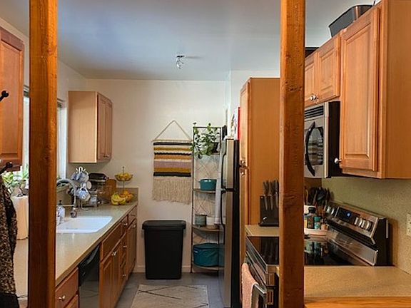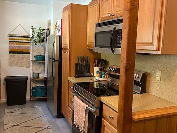 Updated kitchen with all stainless appliances, including a brand new electric range. Updated bathrooms; downstairs bath is a shower/tub combo and upstairs is shower only. Premium hardwood floors in living and dining area, with carpet in all bedrooms and tile in kitchen and bathrooms. Upstairs bedrooms feature multiple closets/storage space. Downstairs bedroom fits a queen bed; upstairs bedrooms fit king beds. New light fixtures, paint and blinds throughout. Full-size washer and dryer. Fireplace with gas insert for heat and wall heat in all bedrooms. Tankless water heater.