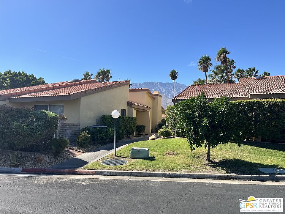 Welcome to Palm Springs Country Club, a quiet, gated community known for its blend of architectural styles, stunning mountain views, and serene atmosphere. Condo Is Ready For Your Own Creative Updates Which Is Reflected In The Asking Price. This lower floor unit, a single story condo with just one common wall unit has 2-bedrooms, 2-bathrooms that offers 1,538 square feet of living space on fee simple land you own the land, not just the unit! Inside, the spacious living room features a cozy fireplace and sliding glass doors that lead to the back patio area, perfect for relaxing. Throughout you will find Mexican Saltillo Tile Flooring. Laundry closet is located in hallway including a washer and dryer. Enjoy easy access to the community pool, located just a short walk away. Built in 1982, this lower-floor unit has great bones and layout, but the kitchen and bathrooms are ready for your updates and personal touch. The community features multiple pools, landscaping, and is conveniently located near Palm Springs International Airport and the I-10 freeway, making it ideal for full-time residents, weekenders, or snowbirds. Short-term rentals are allowed, making this a fantastic income-producing investment opportunity. The monthly HOA fee of $475 includes water, trash, and grounds for peace of mind and easy living. Repairs to be made by buyers after closing. Professional Photos To Be Uploaded Soon!