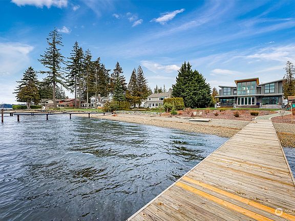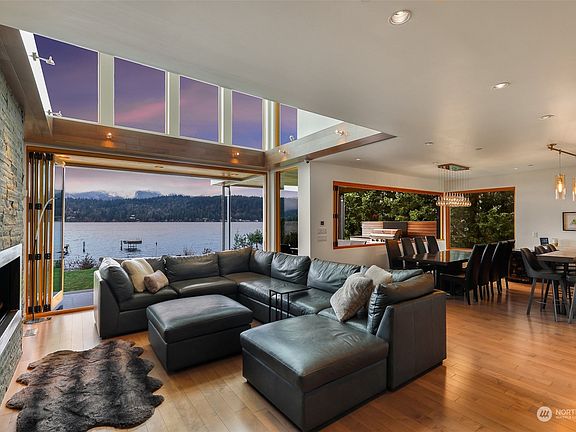 This pristine 4165 sf modern south-facing lakefront home sits on 12197 sf lot & boasts 95 ft of no bank waterfront! Step inside to floor-to-ceiling windows, stone fireplace, w/engineered hardwood floors leading to chefs kitchen w/island, dbl oven, prep-sink & Thermador fridge. MIL suite on main incl kitchen, bath, W&D. Upstairs you'll find a large primary bed w/bath feat heated floors & towel racks, walk-in closet, 7 shower heads & steamer, soaker tub & dbl vanity w/sliding mirrors. Also upstairs: a sun-drenched office, guest bath & 3 guest beds (2 w/lofts) & massive bonus room. Backyard (lakeside) covered patio w/built-in heaters, BBQ & fridge. Integrated hot tub, heat pump, 20KW whole home generator, RV parking, dock, 3-car garage & more!