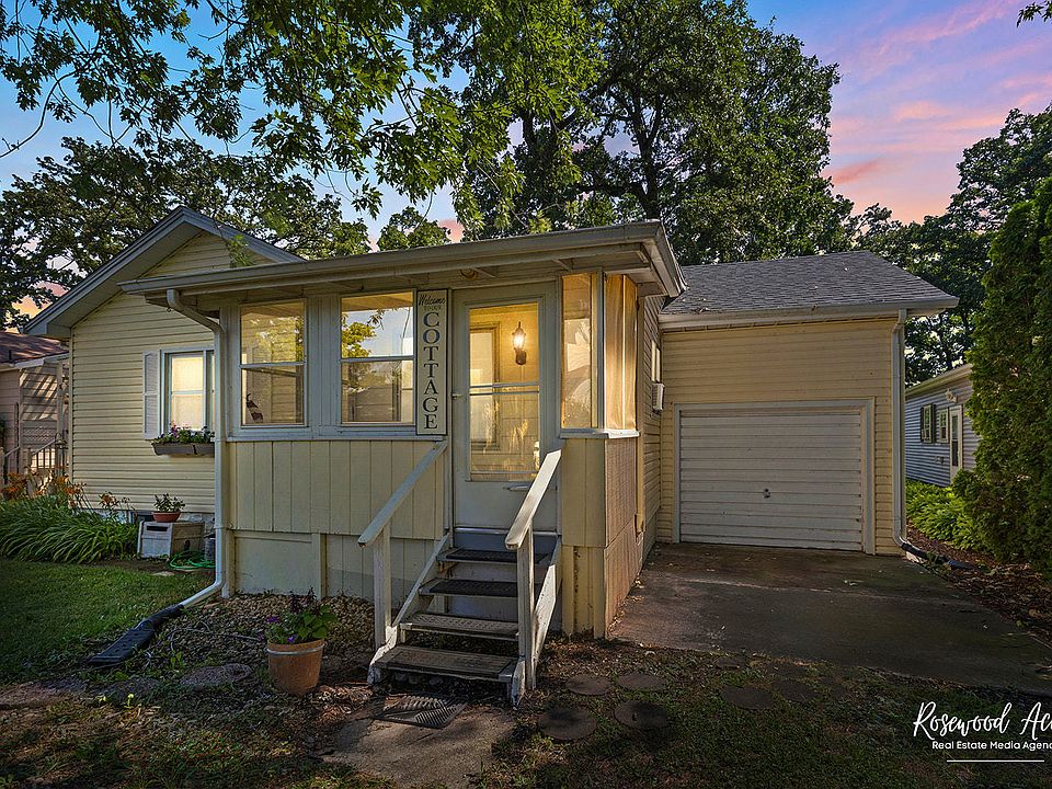 Nestled down a long tree-lined driveway, this riverfront 1-bedroom cottage home offers a peaceful retreat set well back from the road. Inside, you'll find beautiful porcelain floor tiles, a new refrigerator, and an updated bathroom with nice touches and finishes. The cozy wood-burning fireplace adds warmth, while the sunroom is filled with natural sunlight and offers stunning views of the river. French doors lead to a wonderful deck and a large backyard, perfect for gatherings with friends and family. Plus, there's plenty of storage and parking with one attached garage and two detached garages. Bring your boat or kayaks and enjoy this idyllic riverside setting. , .