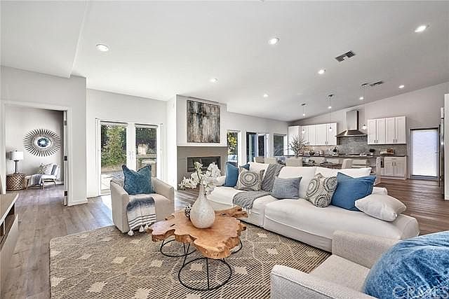 This stunning single story family home was originally 2,169 square feet, was rebuilt in 2018 adding almost 1,000 square feet and the finest contemporary finishes, now 3,137 square feet and complete with all the elements in design and space. An entertainer's dream, this home has a large entryway that greets you with an expansive open floor plan and a sundrenched family room adjacent to the chef's entertainer/gourmet kitchen that has an 11 ft center island of seamless quartz countertop, top of the line appliances, a walk-in pantry and an abundance of European cabinetry. The living room has a built-in console and large windows that look out to the beautifully landscaped yard. This home has a large media/home theater room including a 91 inch motorized projection system with a surround sound system and built-in speakers throughout. A spacious home office could also be used as a formal dining room or den. The master bedroom, also with built-in console, has an en-suite bathroom with a luxurious shower and freestanding European style tub, overhanging crystal chandelier, and his and her vanities. A secondary bathroom also has a separate free-standing tub and an overhanging chandelier. This home is equipped with smart nest smoke detectors/carbon monoxide detectors alarms, Ring doorbell cameras, commercial grade state of the art surveillance cameras around the perimeter of the home, and built in pest control system. Beautifully landscaped rear yard with lots of fruit trees, Avocado tree, orange tree, Grapefruit tree, Lemon tree, Persimmon tree, Pomegranate tree, and Grape vine.
