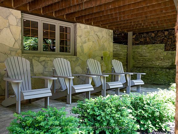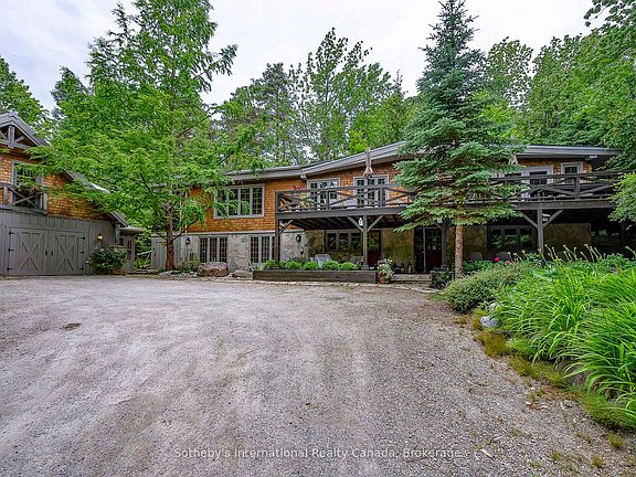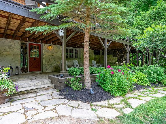 Le Coin Perdu A Private 13-Acre Estate Retreat! Welcome to Le Coin Perdu, a rare sanctuary where timeless craftsmanship meets modern luxury living. Nestled on nearly 13 acres of former vineyard, this private estate offers trails, a managed forest with 300-500 new trees planted annually over 20 years, and a tranquil pond creating the ultimate retreat in nature.Step inside the custom-built residence completely renovated in 1998. Experience rustic elegance at its finest. Hand-hewn post-and-beam timber ceilings, flagstone and BC Pine flooring, and two dramatic stone fireplaces showcase authentic artistry with locally sourced stone and granite finishes. Oversized windows flood the home with light, framing views of lush greenery. The gourmet kitchen features a striking stone sink, stainless steel appliances, reverse osmosis water system, and a dining area with a solid wood table and wraparound banquette perfect for hosting family and friends.The spa-inspired bath offers a jet soaker tub, rainfall shower, and a cedar sauna for four. Outdoors, unwind in the hot tub beneath a canopy of trees, refresh in the outdoor shower, or relax on expansive wraparound decks. The private primary suite includes its own deck for sunset views. A detached 2-car garage built in 2006, crafted with vintage barn board and fieldstone, features a finished 30x40 loft with kitchenette, brass sink, pool table, TV lounge, and full field stone bathroom with open shower ideal for entertaining. Located minutes from Georgian Bays pristine shoreline, Meaford Harbour, premier golf, ski clubs, hiking, biking trails, and vibrant local markets, Le Coin Perdu offers an unmatched lifestyle of luxury, privacy, and adventure.This one-of-a-kind retreat blends European charm, rustic warmth, and modern amenities into a legacy property designed for those who value nature, comfort, and timeless beauty.