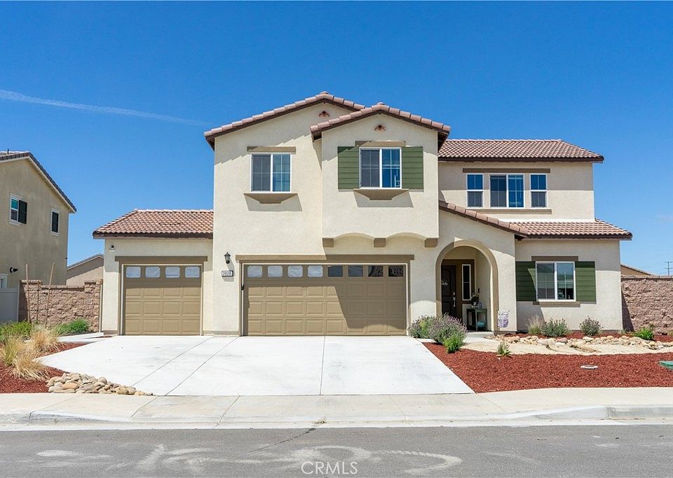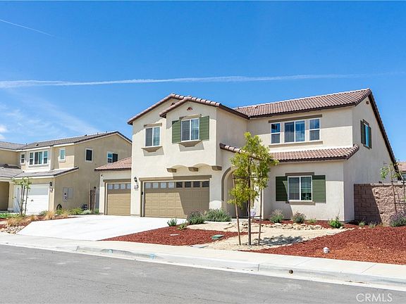This beautiful, contemporary 5-bedroom 3 bath home is located on a cul-de-sac in the Sagewood Community in Menifee. The first floor features a light and bright open concept floor plan with a living room, dining area and kitchen. Also located on the first floor is the primary suite complete with a spacious walk-in closet and bath featuring a dual sink vanity and large walk-in shower, as well as an additional bedroom, bath with a walk-in shower and a laundry room. Upstairs, there is a large loft, three more bedrooms and one more bath with a dual sink vanity and shower/tub combo. Interior upgrades include luxury vinyl plank flooring, an upgraded kitchen featuring white shaker style cabinetry, quartz counters and stainless-steel appliances. Additionally, the newer refrigerator, washer, dryer and owned solar power are included, making this a home a great value! There is a spacious backyard with a patio and a HUGE 3 car garage complete with a Tesla charger and room for all of your toys. A great park is within walking distance and this home is conveniently located close to freeway access and shopping. Come and see your new home today!