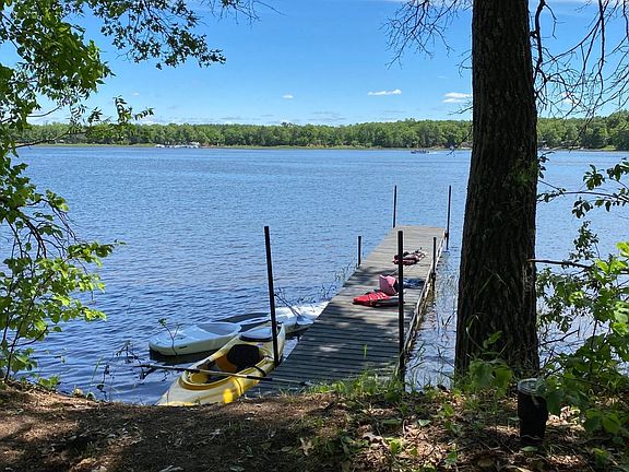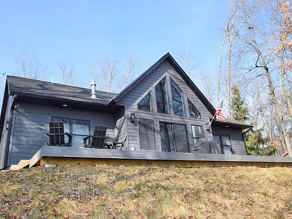 Stunning higher end one-level maintenance-free 4 BR, 4 BA lake home on crystal clear fully rec. Benoit Lake connecting to Rice Lake! Completely turn-key w/furnishings, electronics, kitchen items, linens, etc! Private wooded lot peppered w/pines, 100' of sand shoreline, 0.86 acres & fantastic level area at lake! You'll love the state-of-the-art mechanicals coupled with a Pottery Barn style interior! Polished concrete floors, soaring dark grey pine ceilings, open concept, unique fixtures, hexagonal backsplash, soft grey cabinets, open shelving, black stainless appliances, wood counters, island w/seating, greatroom w/LP gas ledgestone fireplace and lakeside deck. Fantastic layout w/Jack & Jill suites w/each bedroom having its own vanity & stool! Such a great way to entertain guests/kids & maintain privacy! In-floor hot water heat, LP smart siding, composite deck, covered entry porch w/recessed lighting, wood beams & pine/stone columns! An absolute gem that you must see to appreciate!