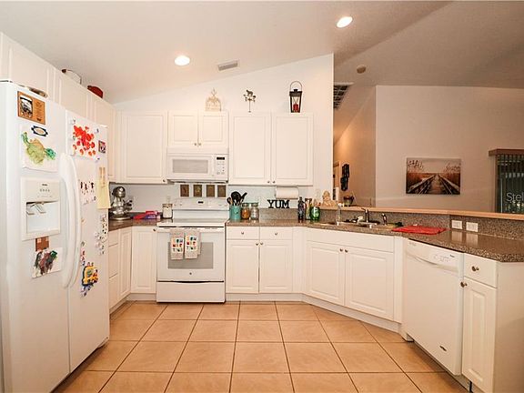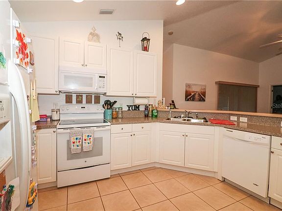 Reduced, Clean and MOVE IN READY! Excellent opportunity to own this beautiful Open and Cheerful Home. Cathedral, Vaulted and Tray Ceilings gives the feel of a much larger home. Recessed lighting in the vibrant tiled kitchen with oodles of bright cabinets, vast counter space and clean appliances will keep you smiling as you prepare a meal and stay engaged with your family from across the long High-Top Bar into the Family Room. The Kitchen, Baths and Foyer floors are nicely tiled and all carpet has been replaced in 2019 and interior walls have been freshly painted in 2019 as well. The Huge Family Room and Master Suite include sliders with great vertical blinds leading to a covered and screened lanai featuring external hurricane shutters that give you a quick and easy way to secure the home. The front covered porch is also screened in and includes accordion shutters at the doorway. Back to that Master Suite! WOW! Tray Ceiling with Fan, Sitting area, slider to lanai, TWO Walk-in Closets, Two separate bright ivory vanities, Shower and Separate Tub, a tiled floor and a private water closet. The exterior of the home was just painted in 2018 and includes upgraded hurricane shutters compared to the norm, especially at the bargain price listed for such a finely crafted home with nice architectural touches welcoming landscaped curb appeal. All appliances convey including the washer and dryer. The owner has a Bi-Annual Service contract in place for Systems and Appliances. Golfing Beaches Boating nearby