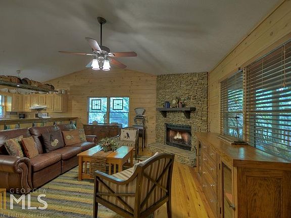 3BR/2BA Mountain Cabin nestled on 1.5 PRIVATE acres overlooking noisy WATERFALL & 400 feet of creek frontage. Open great room features beautiful stack stone woodburning fireplace, wide plank wood floors, fully equipped kitchen w/farmers sink, wood slab breakfast bar, custom touches throughout. 2 bedrooms on main floor w/doors opening to screened porch overlooking the falls. Daylight terrace level includes a huge master suite w/sitting area, family room/den, large deck leading to outdoor firepit area & trail to waterfall. You cant see neighbors from this home and theres room to add a garage. Easy to maintain grounds w/all natural landscaping. Located in popular river resort w/numerous amenities including gated security, 3 pools, tennis, fitness, hiking.