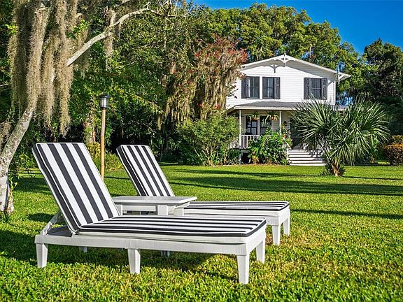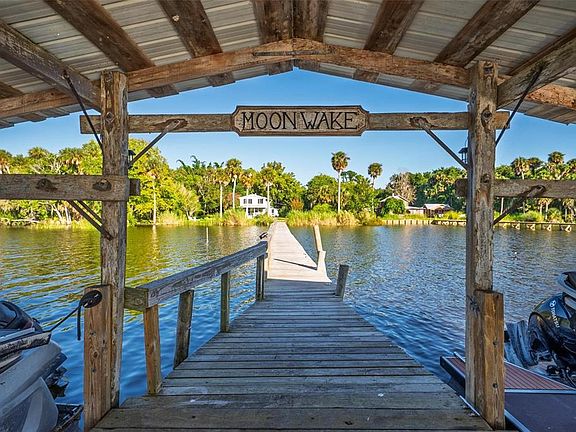 Named for the silvery shimmer of moonlight reflected across the water, “Moonwake”, is a true legacy property. Accessible by ferry or private boat, this turn-key, fully furnished estate offers complete privacy amid 6.9 acres of pristine, “Old Florida”. 5 bedrooms, 2 baths, and 2,146 sq. ft. of timeless character, including original heart pine floors, windows, doors and trim. The property also includes a separate 472 sq. ft. “Cook’s House” with a full kitchen, living area, private bedroom, loft, and bath. Modern updates blend seamlessly with historic charm: remodeled kitchen and baths, high-end fixtures and appliances including a 36” Wolf stove, 52-bottle wine cooler, and on-demand hot water in both homes. 240-ft private dock with two-slip boathouse, 960 sq. ft. drive-in workshop with 110 & 220 service, chicken coop, paddock, and fenced 30’x60’ garden. Mature fruit trees, bamboo groves, and abundant wildlife.
