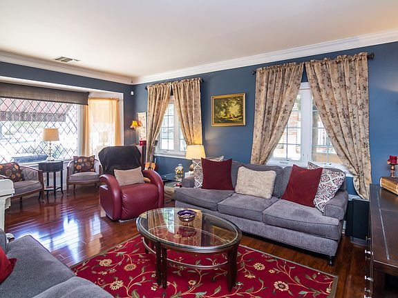 Beautiful expansive home nestled in the foothills of north Duarte. Influenced by the Tudor style, the home features a lovely leaded glass bay window, which graces the front of the house and enhances the spacious living room. Gleaming hardwood flooring continues into the dining room, which has handsome built-in cabinets surrounding the fireplace, an exposed wood ceiling with an elegant chandelier, and a stunning stained-glass window. French doors lead from the dining room to a relaxing covered patio, backyard, and the sparkling pool with spa. The chef's kitchen features granite counters, custom cabinetry, and plenty of windows for lots of natural light. On this level, there are two bedrooms, each with plantation shutters and open beam ceilings, and a shared bath. Upstairs, another charming leaded glass window welcomes you at the stair landing. To your left, there are two bedrooms, one with its own bath, the adjacent one currently used as an office and guest room. The master bedroom is truly a retreat, with a spa-like bathroom with gorgeous chandelier, and a large walk-in closet. French doors lead to a private balcony. ...But wait, there's more! A bonus room off the garage could be multi-use, even another bedroom. This home simply has it all
