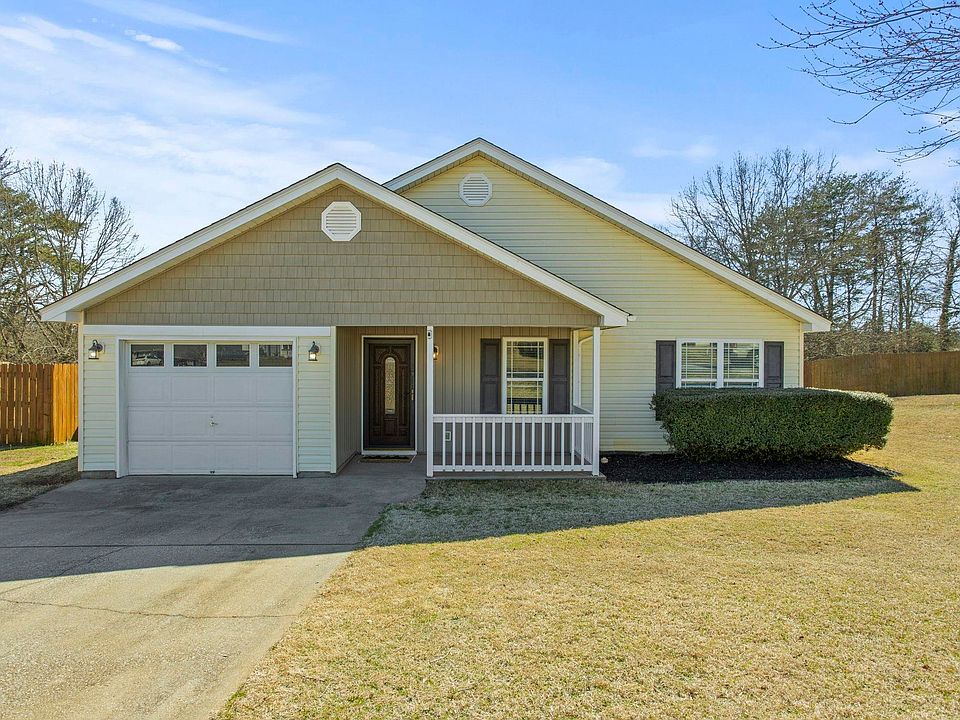 THIS ONE IS IT! Move-in ready 3-Bdrm, 2-Bth OPEN CONCEPT floor plan with 1,437 spacious square feet all on ONE-LEVEL! Enjoy an updated kitchen with tons of modern white cabinets, subway tile backsplash and stainless steel appliances. New (2023) Whirlpool stove, dishwasher and microwave. No need to buy a refrigerator… a side by side Samsung fridge conveys with the home! A large island provides plenty of storage space while serving as the perfect food prep area as well as room for 4 to sit and enjoy a quick meal. The kitchen, dining room and living room flow seamlessly together under an expansive vaulted ceiling making these spaces ideal for family gatherings and entertaining. The focal point of the living room is a charming gas log fireplace with faux tile surround and painted wood mantle. The roomy primary suite easily accommodates a king sized bed with space to spare AND a walk-in closet! The impressive primary bathroom offers tile flooring, a fully tiled walk-in shower with glass doors and “rain” style shower head. Bedrooms 2 & 3 share a nearby full bath. The centrally located side by side style laundry closet will make conquering laundry day a little easier. Step out back onto a 15x12 deck with covered pergola just right for relaxing & grilling overlooking a substantial fully fenced backyard. The one-car garage has shelving for storage and a “Smart Garage Control” feature allowing access through a phone app. This wonderful home comes equipped with a Nest Thermostat, a Ring doorbell and a wireless Security System with window and door sensors. Conveniently located minutes from Wade Hampton restaurants and shopping. No HOA! Don’t let this one get away! Schedule your showing today!