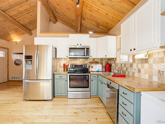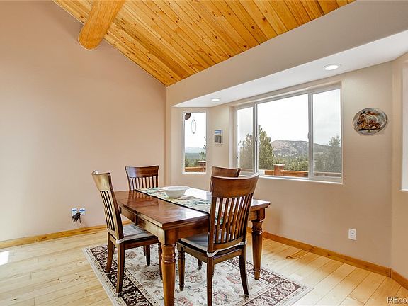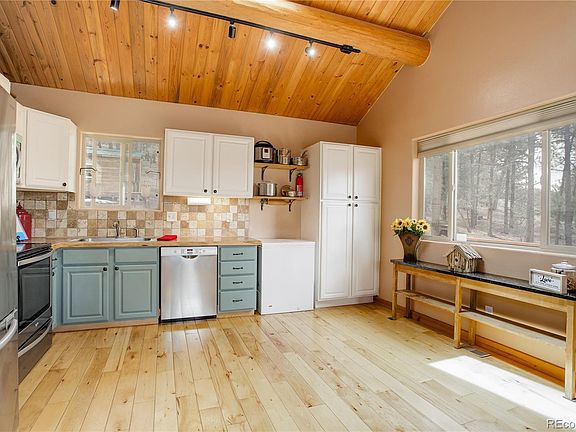 Turnkey mountain home with fantastic views! Private paved driveway welcomes you to this lovely 3 bedroom, 2 bath, 1,688 sq ft home on .5 acres. Vaulted wood ceilings on the upper level with ample windows make this open concept, raised ranch home light & bright. The wood ceiling with beautiful wooden beams & stunning hickory wood floors are cozy & inviting. The open kitchen with newer SS appliances, two-toned cabinets & tile backsplash is well configured & opens onto the dining area for easy living & entertaining. The large newer Trex front deck showcases the spectacular mountain views & is perfect for enjoying the Colorado outdoor lifestyle & barbeques with family & friends. The upper level features 2 bedrooms & 1 full bath. The lower level offers a family room with wood stove, laundry room & spacious primary suite with walk in closet & full ensuite bathroom. Upper deck is gated & opens onto the fenced backyard complete with playhouse & swing set. There is also a convenient shed for storage. HIGH SPEED FIBER INTERNET with speeds up to 1k megabyte download & upload. Newer furnace, water heater, well, pump, pressure tank, water filtration system, gutters, downspouts & metal roof! Siding has been meticulously maintained & property has been well mitigated. County maintained roads & school bus route. Enjoy peaceful, private mountain living with close access to 285, shopping, restaurants & schools! Welcome home to this well maintained, turnkey, upgraded home!!!
