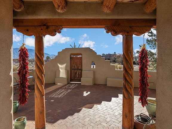 Fabulous Southwest home featuring views & 3 car garage plus a detached 3- car RV garage. Enter through the brick courtyard to the custom built, 2- level, well designed for both indoor & outdoor living. Formal living & dining, spacious family room, kitchen, & breakfast banco. Outdoor kitchen, living area. 3BR's & 2.5 baths downstairs, grand primary upstairs w/ more views. Well designed floor plan, tile, wood, & carpet floors. Vigas, wood beam ceilings, kiva fireplaces, & adobe accents. Kitchen boasts large granite counters, SS appliances, & has easy access to the backyard for entertaining. Hot tub, outdoor kitchen, mature landscaping & tree's. Solar paid for! The detached RV garage is perfect for a shop, RV or car collection. Terrific location, & a great place to call home