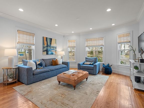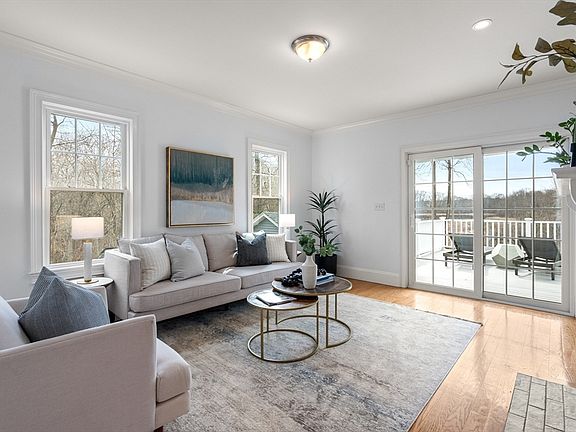Enjoy breathtaking, year-round views of Forge Pond from this beautifully remodeled home in the heart of Canton. Thoughtfully updated with a perfect blend of classic charm and modern convenience, this residence offers an open layout with high ceilings, gleaming hardwood floors, and custom millwork. The remodeled kitchen serves as the heart of the home, featuring granite countertops, a large island, stainless steel appliances, gas cooking, and ample space for gathering. Flanked by an open dining area and family room. A separate seating area/den leads you to the back deck, a perfect place to take in the view. On the second level, you will find three generous bedrooms and two full bathrooms. The third level features a bonus room that can be used as a fourth bedroom and access to additional storage in the attic. The partially fenced yard features a newly built patio and a hot tub. Central heat/AC throughout. Conveniently located within walking distance of town, schools, and the train.