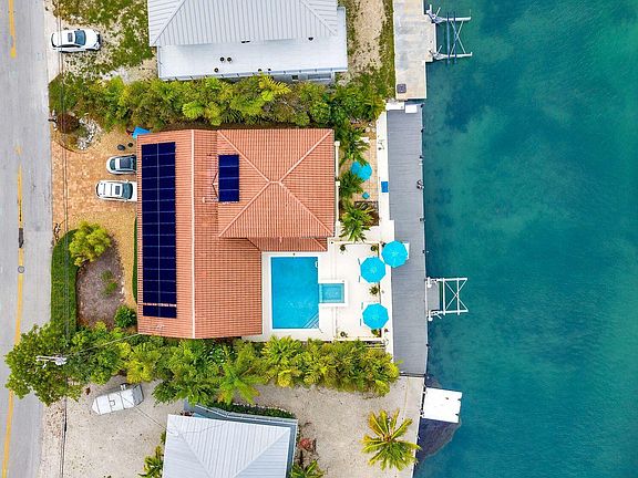 Duck Key paradise awaits! Looks can be deceiving from the front on this stunning canal-front home has many amenities which include 90 ft of dockage, deep water access, a 12,000-pound boat lift, a 220V dedicated line that can be electric car charged, a pool (heated), Pool is completely resurfaced as of August 2023 and a hot tub. Quick access to both the ocean and gulf. This energy-efficient home harnesses the power of the sun with the newly installed Enphase Solar system. Imagine not having an electric bill! A nicely marble-paved driveway leads you to an enclosed, temperature-controlled garage. Continue inside and walk into an open floor plan that includes tile throughout, a gorgeous coral accent wall, and a wet bar. The updated kitchen includes granite countertops, wood cabinets, stainless steel appliances, and a propane gas stove. Sliding glass doors throughout allow natural light along with beautiful views of the pool and canal. The master bedroom is on the first level with an ensuite bathroom and walk-in closet, so no need for any stairs. Continue upstairs which has two large guest bedrooms, two full bathrooms, and an open office space that could be converted back into a 4th bedroom if desired. Seller is in process of receiving dock permit for the next buyer to pursue replacing the dock. Estimate of $75,000 for trex decking replacement. Buyer would be responsible for replacement. This home is perfect for a full-time residence, enjoying as a second home or investment. Learn about Club Duck Key Here http://www.clubduckkey.com/