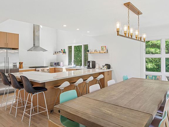 Perfectly situated on an acre in the heart of Water Mill, this newly renovated contemporary delivers style, space, and convenience—just 4 miles to Southampton Village, 5 to Bridgehampton, and 9 to Sag Harbor.Thoughtfully updated, the 5-bedroom, 5-bath home blends crisp modern finishes with natural light and open flow. The first floor features a spacious living room with fireplace, skylit sitting area, and seamless access to the expansive deck. The chef’s kitchen is outfitted with marble countertops, premium stainless steel appliances, and an inviting dining area. The first-floor primary suite includes its own sitting room and direct outdoor access, ideal for multi-generational living or a luxe guest setup.Outside, enjoy a lush backyard with mature landscaping, a heated pool, and multiple entertaining areas—including a roof deck perfect for sunset views. A rare bonus: the oversized garage can accommodate up to five cars.