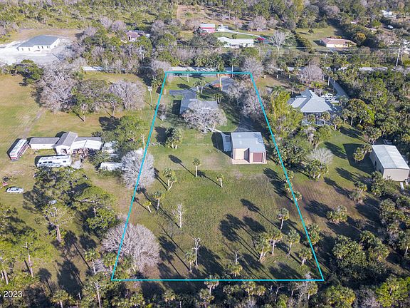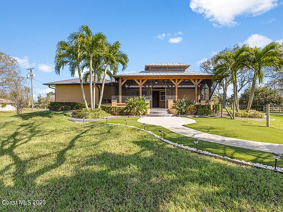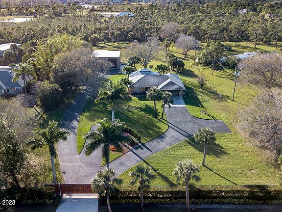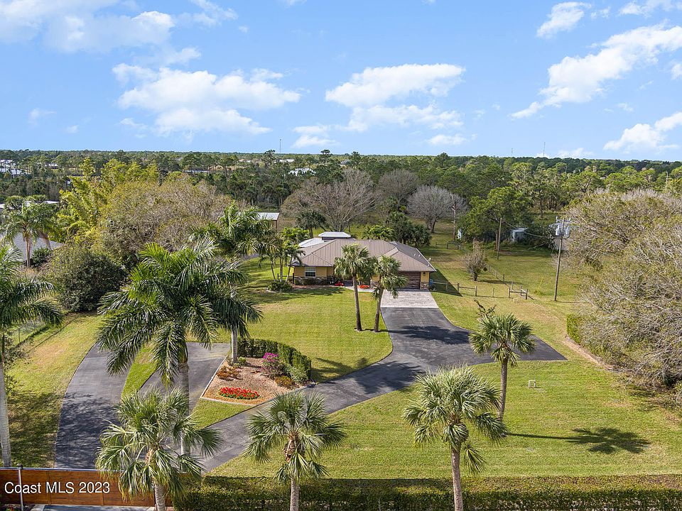 Fantastic Opportunity to own 2.4 Acres of Privacy in Malabar, immaculately maintained split floor plan residence PLUS a 2,000 square feet detached garage! Modern motor operated entry gate with privacy hedges, offer a stunning and private curb appeal. Fully paved driveway entries to the Residence & Detached garage offering additional parking areas! PLUS Beautifully landscaped! 1490 square feet of living space featuring Tile floors throughout the main living areas, Upgraded Kitchen with white quartz, wood cabinetry, farm kitchen sink & a walk-in Pantry. Cozy master suite with shiplap accent walls, walk-in closet PLUS an upgraded master suite offering a walk-in glass shower & updated vanity. The inviting living space with vaulted ceiling, features French doors that open up to the stunning outdoor 30 x 30 living space, with vaulted aluminum & wood enclosure, fully screened & stamped concrete patio floors which Overlooks the additional land, creating the perfect countryside oasis. The exterior opens up a private area fenced area for the pets with astroturf finishes. As you make the way through the outdoors, soak in the 2,000 square feet detached garage, with 12 X 14 Ft roll up Doors, with 2 doors in the front and one rear door. Large enough for all your toys and up to a 42 foot boat & trailer w/separate 220 electric & water. Metal Roof, 2 Water Softener Systems, Epoxy Floors & More! This is a distinctive property with valuable upgrades through every corner! Don't miss your opportunity to purchase this turn-key country dream!