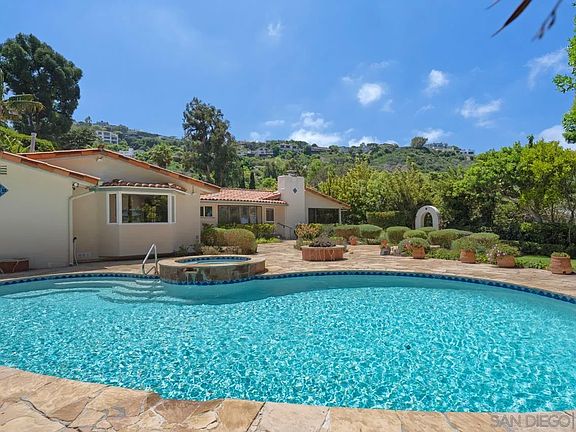 Ideally located in the prestigious Hidden Valley community, this sun-drenched single story Hacienda compound style residence boasts beautiful water views and is privately nestled on an immaculate half acre lot that's surrounded by mature trees, lush gardens and features a heated swimming pool with spa and fire pit. Spacious interiors flow out to the large centre courtyard and manicured rear yard that are perfect for entertaining. The master bedroom wing is complete with an additional room which is ideal for an office, sitting room or nursery. Separate casita, double car garage and additional off street parking for 8+ cars. Zoned AC/Heating system. Within moments to La Jolla Village, La Jolla Shores Beach, schools and freeways.
