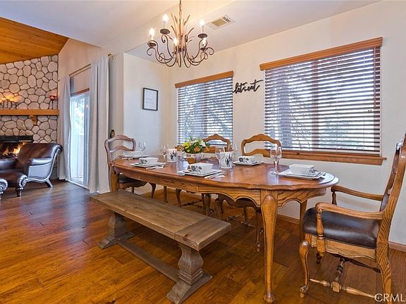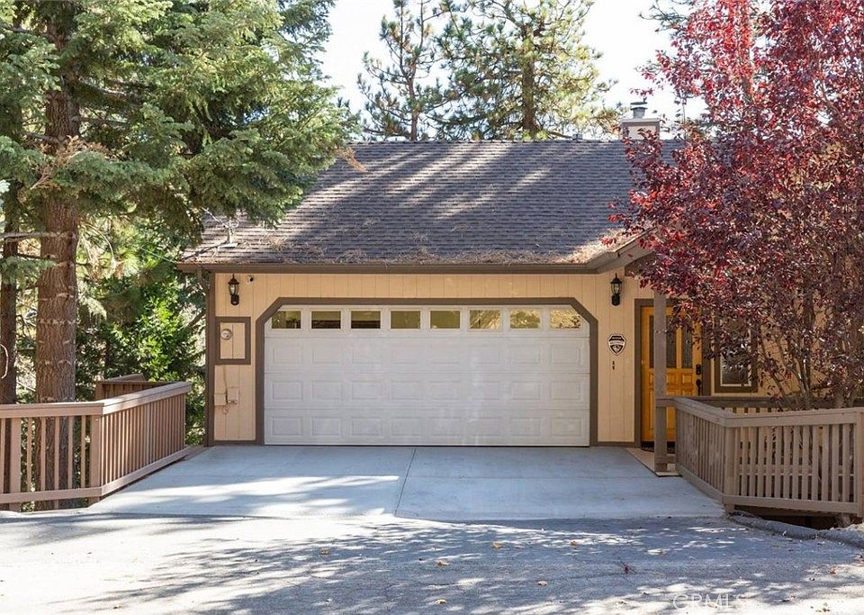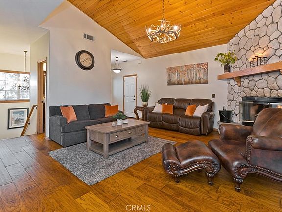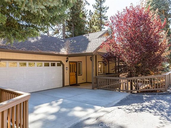 Retreat from the hustle and bustle of the city and enjoy the splendors of nature in glorious Lake Arrowhead! Nestled against the mountainside, a stunning 2,076-sqft home with a level driveway entry and an attached 2-car garage is framed by a gorgeous mixture of tall trees that lead into a classic mountain cabin style home with modern features. An open floorplan encapsulates the living room, dining room and kitchen with gorgeous laminate flooring. The living room enjoys a high slopped paneled ceiling, a stone fireplace with a raised hearth plus a wood mantelpiece, and access to the private balcony. Through the dining room is a bright kitchen with blonde wood tone cabinetry, earth tone granite counters, and built-in appliances highlighted by recessed lights. The first floor includes direct garage access and a guest powder room. Descend the staircase to the ground level to enjoy a cozy family room featuring a stone fireplace similar to the one upstairs and access a truly private lower-level balcony with views of the mountains. Each bedroom is complete with plush carpeting, well-sized windows, and even one with side yard access. The primary bedroom delights in exclusive access to the private lower-level balcony and en-suite bathroom complete with a dual sink vanity and stone shower. This marvelous mountain home includes lake rights, central HVAC, a 22kw full house generator, and faces a maintained road for consistent winter city clean up. A beautiful woodland home to enjoy!