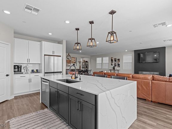 This gorgeous and move-in-ready 5-bedroom home in the heart of Inspirada showcases exceptional upgrades, modern finishes, and captivating city and mountain views. Meticulous care is evident throughout, featuring a flexible layout that includes a secluded downstairs bedroom with a full bath—ideal for visitors, extended family, or multi-generational living. The gourmet kitchen is a true showpiece, complete with premium appliances, elegant custom cabinetry, a generous walk-in pantry, and a large island designed for both cooking and conversation. The open living and dining areas transition effortlessly to the inviting backyard, where the absence of rear neighbors provides serene privacy and panoramic mountain views—perfect for unwinding or entertaining. Nestled within the desirable Inspirada community, residents enjoy access to scenic parks, walking trails, and exceptional amenities, making this contemporary home the ideal balance of comfort, sophistication, and convenience.