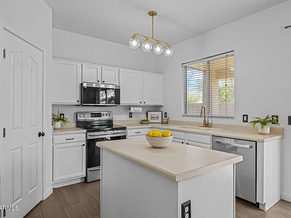 Downstairs, enjoy a fresh and inviting layout with new appliances in the kitchen, a spacious living area filled with natural light, and a modern color palette that flows seamlessly throughout. Upstairs, the bedrooms offer comfortable retreats, with the primary suite featuring a custom walk-in closet and updated bathroom finishes. Step outside to your own private backyard paradise. The sparkling pool, accented by tranquil lighting and a waterfall feature, is ideal for Arizona evenings. Adjacent is a stylish 240-square-foot air-conditioned detached structureperfect as a home office, gym, or creative retreat. Entertain around the fire pit, lounge on the turf, or just relax in this expansive outdoor setting.