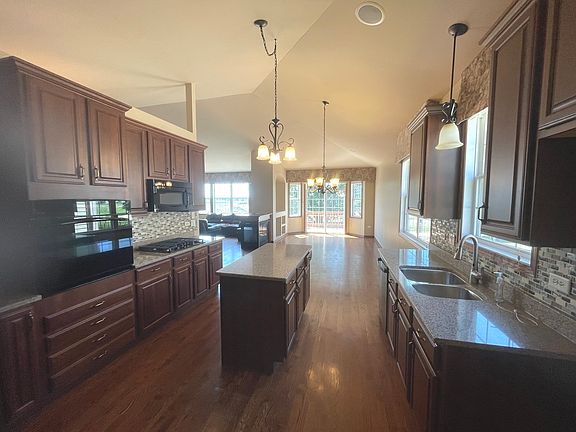 Step into timeless elegance with this beautifully designed Red Oak Model ranch home, featuring a welcoming brick and stone-covered front porch entry. Inside, the gourmet kitchen is a chef's dream, complete with quartz countertops, 42" upgraded maple cabinetry, a built-in oven, 5-burner cooktop range, ceramic tile backsplash, pantry, and dishwasher. Rich hardwood flooring flows through most of the main level, complemented by six-panel hardwood doors and custom window treatments including valances and pleated shades that stay with the home. The spacious family room offers a cozy ambiance with a two-sided fireplace framed by an oak mantel and a built-in entertainment center, enhanced by surround sound throughout the home. A private den with built-in desk and cabinetry provides the perfect space for remote work or quiet study. The master suite is a true retreat, featuring a tray ceiling, bay window, and his-and-hers matching closets. The luxurious master bath includes dual comfort-height vanities, a jetted tub, and a separate shower with clear glass doors. Guests will appreciate their own private bedroom and full bath, offering comfort and privacy. The professionally finished English-style lookout basement expands your living space with an open-concept layout, full bathroom, recreation room, bonus room, and a third bedroom with elegant French doors. Outside, enjoy a fully fenced 6-foot privacy backyard, professionally landscaped and ideal for entertaining with an 11' x 21' paver patio and a 10' x 10' composite deck off the family room. Additional features include a sump pump with backup battery and new air conditioner (2024) for peace of mind. This home blends luxury, functionality, and charm in every detail. Don't miss your chance to own this exceptional property-schedule your showing today and discover the lifestyle you've been dreaming of.