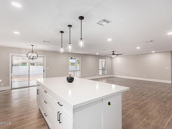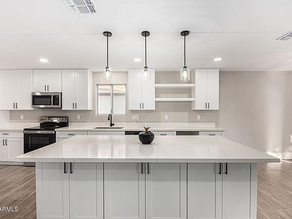 Welcome to your dream home in the vibrant Sun Lakes community! This stunning 3-bedroom, 2-bathroom residence boasts a brand new roof and A/C for ultimate peace of mind. Step through stylish double doors into an open floor plan that exudes modern elegance w/ wood-look tile flooring, a fresh neutral palette, and updated lighting. The upscale kitchen is a chef's delight, featuring crisp white cabinetry, high-end stainless steel appliances, and stunning quartz countertops, all centered around an island with a breakfast bar. The spacious master retreat includes plush carpet, direct outdoor access, two sizable closets, and a pristine ensuite with a step-in shower. Step outside to your expansive backyard, complete with a covered patio - ideal for entertaining. Do not miss out on this one!