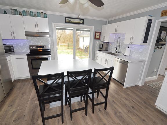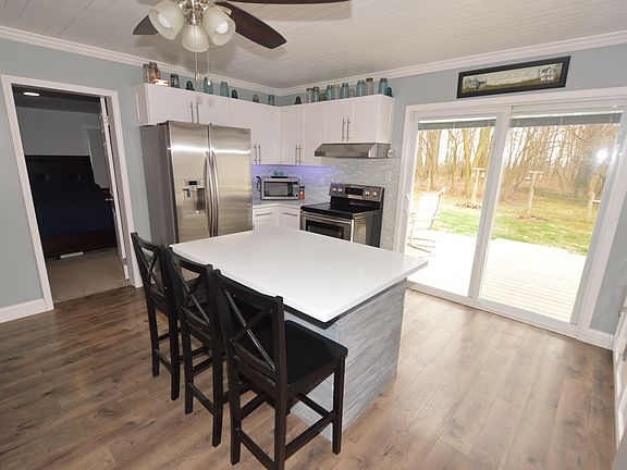 Absolutely darling 2 bedroom 1.5 bathroom home situated on a 3 acre wooded lot. Everything in this home has been updated and remodeled. Brand new eat-in kitchen with high end cabinetry. Island is full of 8 drawers for storage. Gorgeous corian countertops. Custom tile backsplash and new farmhouse sink with new fixtures. All new light fixtures. Brand new stainless steel appliances. Full bathroom is all new with custom ceramic tile work, jetted whirlpool tub and ship lap ceiling. New laundry area conveniently located on the main level. Large master bedroom easily holds a king size bed and has double closets with custom organizers. 2nd bedroom has 1/2 private bathroom all recently remodeled. Everything is new: carpeting, flooring, trim and interior doors. New patio doors to rear deck. New furnace, new tankless gas water heater, new 200 amp service panel, all new windows. New garage doors. The basement is also finished and has been professionally water proofed and reinforced by Ohio Basement Authority. Plenty of storage in this home. 3 acres has a fenced area, chicken coop, walking trails, fruit trees, perennials and black walnut trees. Owner is going to be installing new downspouts and gutters. Low utilities here! Propane forced air. Ohio Edison for electric and Spectrum for high speed internet. Seller used less than one tank of propane over the past 12 months and electric runs less than $170. Garage is an oversized 2 car. There is plenty of space for a workshop. Wood stove does not stay. Refrigerator and range negotiable.