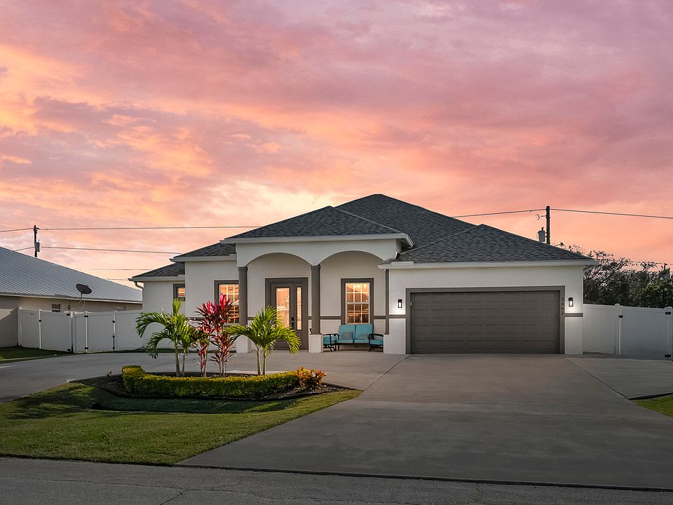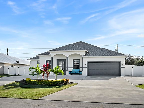 Welcome home to this custom 2021 5-bed, 3-bath CBS home featuring impact windows, high ceilings, crown molding, 42'' cabinets with quartz countertops and backsplash, a breakfast bar, built-in speaker system. The split floor plan offers a spacious primary suite with two walk-in closets. The luxurious primary bathroom includes dual vanities, a soaking tub, and an oversized walk-in shower. The back bedroom serves as an in-law suite with its own bath and exterior entrance, also acting as a cabana bath.Step outside to your private retreat, perfect for entertaining, complete with a brand-new heated saltwater pool and spa with Pentair IntelliCenter smart automation, sun shelf, water slide, and an extended patio with an oversized pergola, all within a fully fenced yard! Bring all your toys! The oversized circular driveway fits up to 10 cars, a trailer, and a boat! The home also offers a double gate on the left side for more toys! Enjoy peaceful mornings on the screened lanai and the convenience of a prime location just minutes from I-95, shopping, dining, Tradition, and hospitals, all with NO HOA! Don't miss out on this must-see gem!
