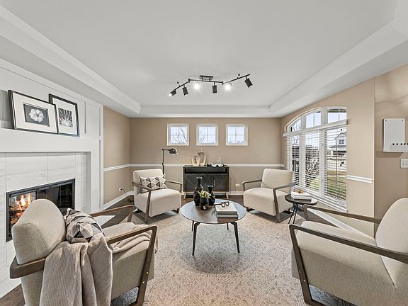 Don't wait for new construction when this beautiful home is available now WITH a finished basement! This open concept home has so many beautiful updates! A full finished basement including an entertainment area with sink, ice maker, quartz counters, a rec room PLUS modern full bathroom and potential 5th bedroom! A perfect in-law suite! Great curb appeal with a covered porch nestled on a .34 acre lot. The 1st & 2nd-floosr feature hand-scraped birch hardwood floors and contemporary wall colors, current finishes and plenty of storage! The open concept main floor has a double-sided fireplace, soaring ceilings in the family room, an office, and a beautiful warm white kitchen with huge breakfast bar that can seat at least 6. The wide wrought iron staircase leads to master bedroom with tray ceiling, sitting area and spacious bathroom with separate shower, tub and double sinks as well as 3 more bedrooms and open hallway with view of the family room. This home comes equipped with owned solar panels and a security system. The solar panels were purchased with 25year warranty. The new owner can move and enjoy lower electric bills. Water heater 2019, basement finished 2020. A stunning home that won't disappoint!