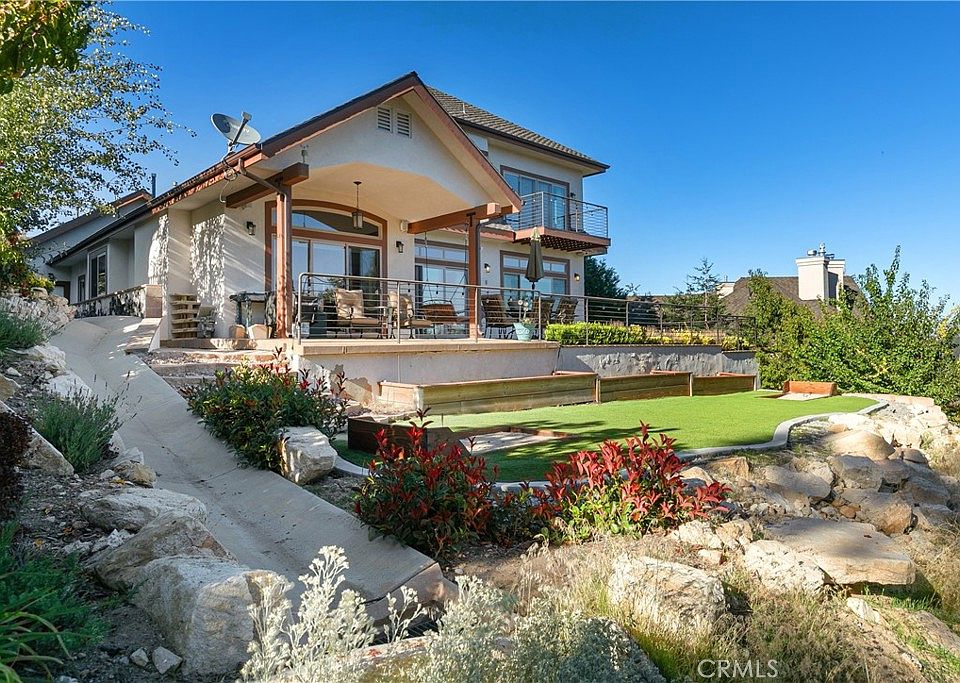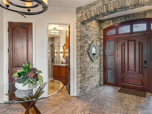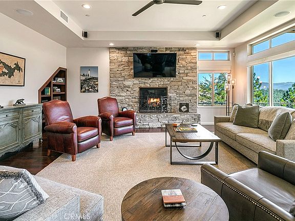 This architecturally distinct home is an epitome of elegance with its exterior stack stone, interior smooth pale walls, and rich wooden detailing. A grand stone-embellished foyer welcomes you, leading into a spacious great room adorned with hardwood floors, a stack stone fireplace, and custom lighting. Enormous windows offer uninterrupted views of the ridge and Big Bear, perfectly complementing the room that seamlessly extends to a well-designed patio. Multiple outdoor entertainment options await: BBQ, dine al fresco, or relax by the fire pit. The yard also features a fun horseshoe game area.