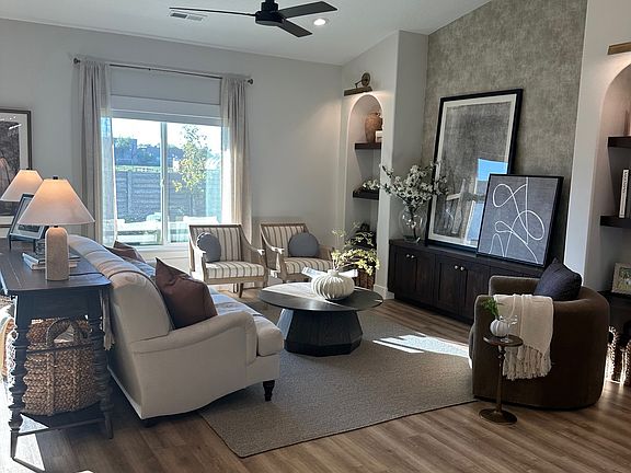 Welcome home to this turn key exquisite SINGLE-LEVEL home. MOVE IN READY! Our one level parade home floor plan is an Ovation homes fan favorite, and it will wow you! The heart of the home boasts a large oversized island, perfect for entertaining, and a well-appointed pantry. Floor plan provides an ample amount of storage. A generously sized pantry will ensure all your kitchen essentials are within easy reach. A 6-foot sider off the back opens to a covered patio, creating a seamless indoor-outdoor living experience. A community pickleball court for some fun times. Call today for a private showing.