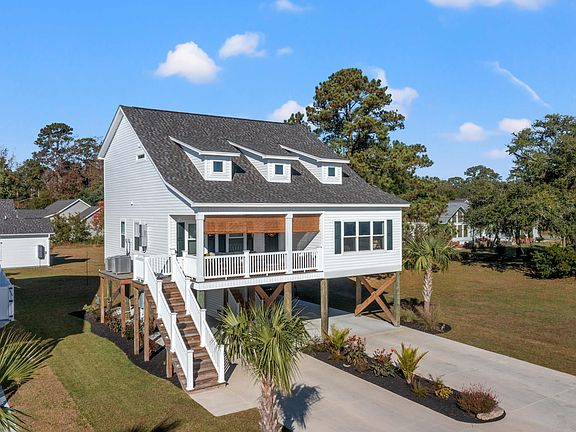 Located in the Harbor Club on Winyah Bay, this 2226sqft beach style home is surrounded by views of oak trees, Winyah Bay & the Intercoastal Waterway. Built 2024, the elevated 4Bed/2.5bath home provides a covered garage area under the main level. The front porch (10ft X 19ft) faces the water with views of the community dock & boat landing. Main living area is open to a spacious kitchen with gas stove, marble countertops, pantry & island with seating space. Primary bedroom suite on the main floor includes dual vanities, tiled shower & walk-in closet (7.3ft X 9.4ft) where a pocket door gives direct access to the laundry room. Upstairs is a loft flexspace sitting central to 3 additional bedrooms, 2nd full bath, storage closet & separate utility room w/ access to the walk-in attic storage.