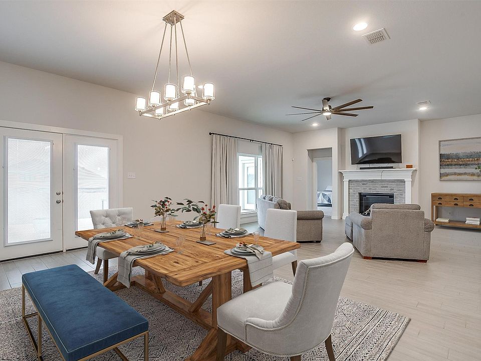 Gorgeous Homes by Towne built home in the highly desirable Mountain Valley Lakes. 3 bedrooms, Office, dining area, 2.5 baths and 2 car garage. 2,648 sq foot of open living space. Abundance of natural lighting through out. Wood look tile flooring in all main living areas. Split bedroom floor plan with spacious secondary bedrooms. Stunning kitchen with large island, stainless steel appliances, custom backsplash and quartz countertops. Kitchen flows nicely into the large living area with wood burning fireplace. Dining area open to both kitchen and living room. Perfect for entertaining. Oversized primary bedroom with ensuite bath. Separate shower, soaking tub double sinks and walk in closet with private back patio access makes this owner space the perfect retreat after a long day. Enjoy a cup of coffee on your oversized and extended back patio complete with a hot tub. This home is must see.