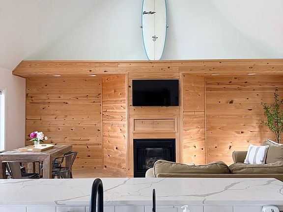 Gas fireplaceSpacious deckVaulted ceilingsLakeside fire pitBbq grillModern appliancesPrivate sand beach