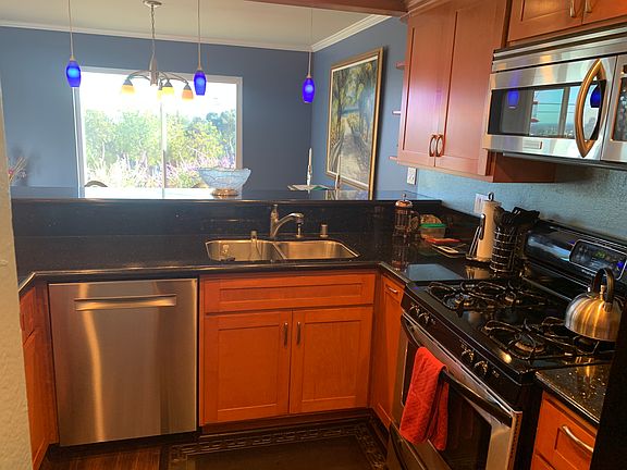 Panoramic ocean views from every room! This modern oasis features 2 very spacious bedrooms and 1.5 bathrooms. As you enter, this open floor plan showcases an elegant living room with a black stone fireplace, hardwood flooring, recessed lighting. The gourmet kitchen includes all granite counters, with a separate dining room, living room, with one of two balconies, steps away. Perfect for entertaining with over 1300 square feet of private indoor/outdoor space. The two spacious bedrooms upstairs have beautiful ocean views. The current owners spared no expense to remodel this unique property that features an upstairs Tiffany Blue colored bathroom (appropriate for this gem!) with a double rain shower, custom tile and a double vanity. The built-ins in the master closet can accommodate the wardrobe of any discerning fashionista. Also included on the first floor next to the kitchen is an enclosed space for the full sized washer and dryer. Two-car garage, and only 1 common wall.