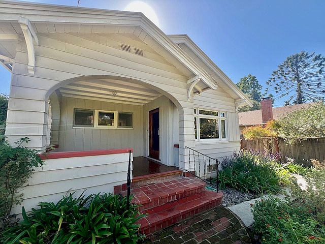 Discover timeless charm and modern comfort in this beautifully updated 1924 Craftsman Bungalow, located in Santa Barbara's highly desirable San Roque neighborhood. Step inside to find original wood flooring, detailed wood trim, and abundant natural light streaming through numerous windows. The inviting living room features a wood-burning brick fireplace, a large picture window overlooking the front garden, and a classic secretary desk. Mahogany French doors open to the dining room, which boasts a built-in hutch with dual China cabinets. The updated kitchen is equipped with new stainless-steel appliances, ample cabinetry, and beautiful granite countertops. Just off the kitchen, a charming red-tiled utility porch offers convenient washer and dryer access. Both bedrooms are bright and comfortable, with the primary bedroom offering two closets and generous space. The updated marble bathroom features a tile shower/tub combo for a touch of modern luxury. Enjoy relaxing on the covered front porch with mountain views perfect for sipping iced tea on sunny afternoons. The front yard includes raised garden beds, ideal for growing vegetables or flowers, while the spacious backyard features fruit trees, a dry rock bridge, and a patio for evening BBQs and entertaining. Located near the Santa Barbara Mission and Rocky Nook Park, this home combines historic charm with modern convenience in one of Santa Barbara's most sought-after neighborhoods.