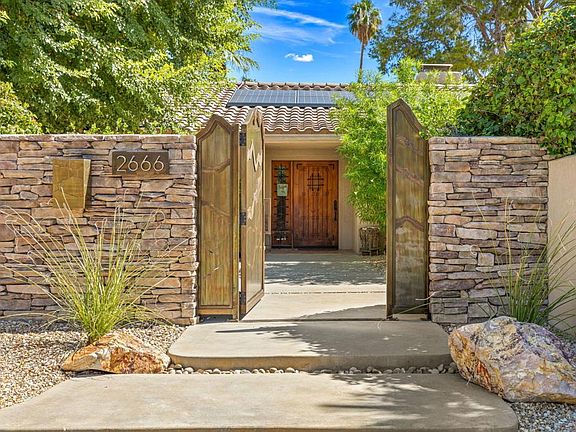 Surrounded by soaring mountains, perfectly poised beside Frank Sinatra's favorite Palm Springs golf course and Walt Disney's personal retreat, lies a Mediterranean Modern gem that blends enduring elegance with modern functionality, natural charm and indoor-outdoor living in the heart of the exclusive Indian Canyons neighborhood. After passing through the stunning custom-crafted entry gate, you're embraced by an alluring private front courtyard, ideal for sunset cocktails and nighttime star gazing among bountiful bougainvillea, oleander and mesquite trees. Once inside the rustic pecan door, you're welcomed by a light-filled foyer with tumbled travertine tile seamlessly connecting a comfortable living room with large gas fireplace to pool view dining and entertainment spaces including a sumptuous eat-in kitchen with sparkling granite countertops, tailor-made cabinetry and a gourmet indoor barbeque. Beyond are two spacious patios, a heated pebble tech pool with tanning ledge, and a bubbling jacuzzi, beckoning you to stretch out and relax in this wonderous backyard sanctuary. The home's north wing leads to a relaxing master suite and bath with rainfall shower and clawfoot tub adjoining a secluded fountained alcove. A lovely second bedroom graces this section of the home, as does a third bedroom or den with artisan-designed built-in shelves and drawers. Across the hall is a spa-inspired bathroom with oversized shower alongside handcrafted cabinetry and vanity table. On the south wing is a well-appointed home theater, complete with recessed Aquos Quattron 80'' 3D TV and Denon multi-media sound system. Tucked nearby is a cheerful home office plus a full-size laundry room and two-car garage. Overhead, a 32-panel solar system provides performance guaranteed year-round comfort and smart technology at a significantly below market lease rate. When you wish upon a star for the ideal primary or second residence, or luxury vacation rental property for celebrity guests, this 2569 square feet of desert heaven is everything you could ask for and much more.