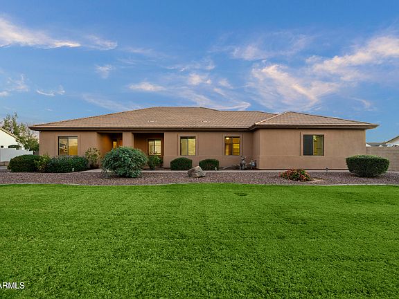Acreage, freedom, and function—right where you want to be. Set on a full irrigable-style one-acre lot in Poco Bueno Ranchos, this custom single-level sits within a neighborhood of multimillion-dollar homes and blends everyday livability with ''bring the toys'' practicality: automatic gated entry, 4-car garage, RV gate/parking and huge workshop give you real options. Inside, ~2,778 SF spans a split plan with 3 bedrooms + den/office, generous great-room living, and a chef-ready island kitchen. The primary suite offers backyard access, dual closets, and a soaking tub. Out back, a private pool anchors a deep, use-the-land yard—ideal for gatherings, gardening or future casita/ADU ideas. All with no HOA, city water + septic, and easy access to Agritopia, SanTan Village, and top Higley schools.